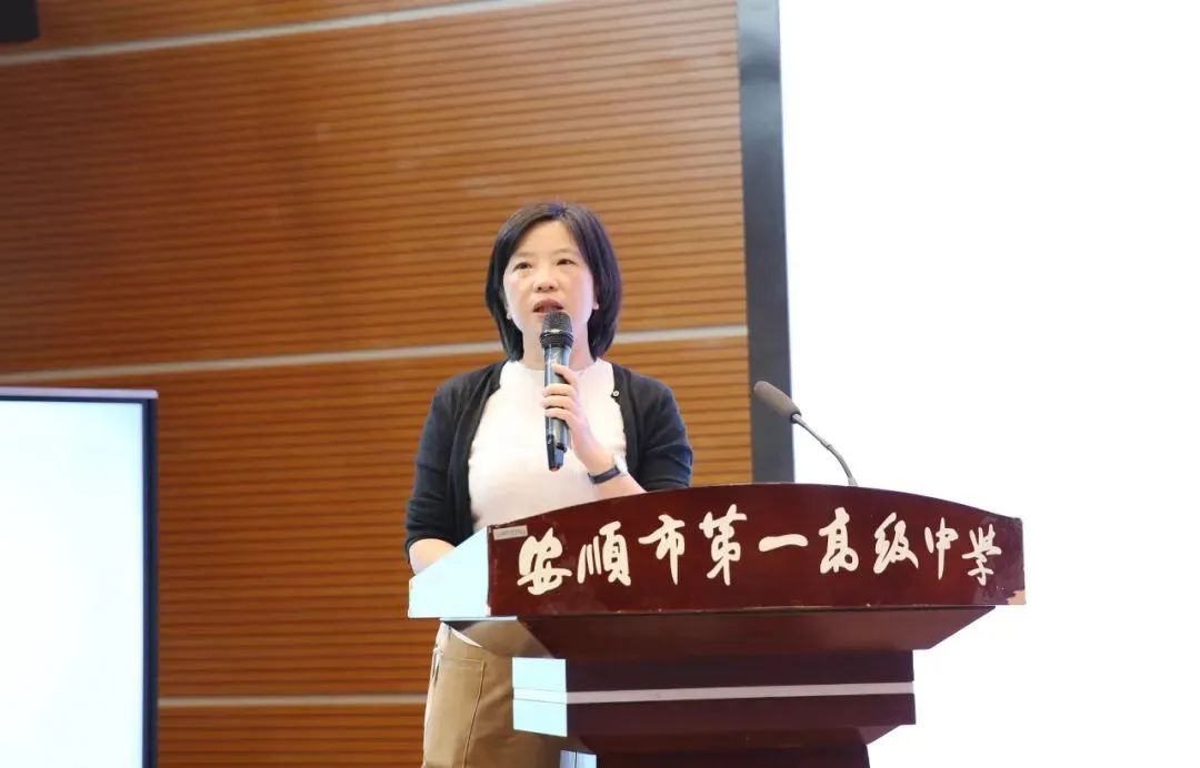 安顺市教育考试中心主任黄海燕致辞,她从抓好思想政治课的重要性进一步希望大家要积极推进教育教学改革,发挥好思政课的独特作用。