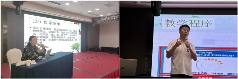 四堂研讨课例中,执教教师用心思考,思维碰撞,紧扣大单元与核心素养目标进行设计,定位与表述准确,可操作性强,学习目标可评价,教学过程结构合理,层次分明,条理清晰,遵循了教学与认知规律,注重学、练、赛、评,获得与会教师一致好评。例如,研讨课《小篮球——双手胸前传接球》,体现了优秀课常态化、常态课优质化特点;展示课《趣味耐久跑》,链接科学教师视频,讲解关于耐力跑时肺呼吸原理,呈现跨学科学习思想,使用智能设备监控学生运动负荷,体现现代信息技术与体育教学相融合思维;研讨课《土家族花灯》,展现少数民族传统体育文化进课堂风采;展示课《小篮球——行进间运球》,创设“捕鱼达人”情境,催生出学生幸福笑脸。