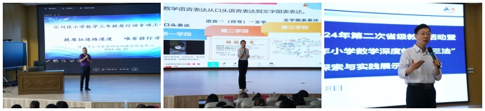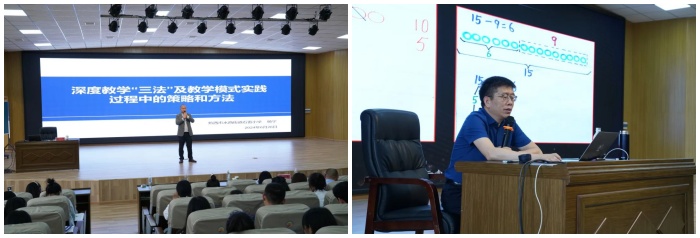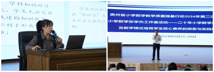 在专题讲座环节,张学杰作题为《深度教学“三法”及教学模式培育学生核心素养的探索与实践》的主题讲座,提出深度教学“三法”:抓住简单问题让学生表达起来,抓住美妙回答让学生思考起来,抓住认知关键环节让学生智慧起来,简称深度教学“三法”;云南省教科院小学课程教材教学研究室副主任管尤跃作题为《基于核心素养的小学数学深度教学实践研究》的专题讲座,介绍了深度教学的理论体系和实施方法;来自贵州一线的两位教师分别作题为《深度教学“三法”及教学模式实践过程中的策略和方法》《指向核心素养的小学数学单元教学研究》专题讲座。通过专家的引领和指导,提升了与会老师的认识深度和理论水平,使教师们对深度教学和深度学习有了更清楚的认识和理解。