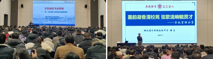 湖北省水果湖高级中学党委书记、教育部基础教育教学指导委员会生物学教学指导委员会委员潘尖以《墨玉凝香濡校苑 弦歌流响毓贤才》为题,从完善课程改革、注重个性培养,立足高效课堂、推动教学改革,强化教研引领、落实集体备课,狠抓教学常规、实施精细管理,打造教师队伍、赋能学校发展等五个着力点介绍了学校教学管理经验,并分享了学校德育管理、校园心理安全防范等方面的方法措施。