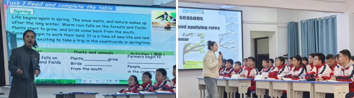 全省九个市(州)推荐的十位教师以及江苏省授课专家分别展示了沪教版七年级上册Unit 3 The seasons阅读课和语法课两种课型。十一节课充分体现出“同中求异、异中求同、同课异构、同放异彩”的教学特质。老师们通过创设真实的英语交流场景,让学生迅速融入课堂,在互动中提升语言能力;采用任务驱动教学,将课程内容分解为逐个具体任务,以任务链的形式开展课堂教学活动;课堂教学环节紧凑,小组活动组织有序,充分调动了学生的主动性与创造性;多媒体资源运用巧妙,激发学生学习兴趣,增强学习趣味性,提升了课堂学习效益。