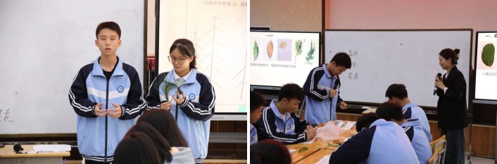 在第1课时的展示中,贵阳市、毕节市、安顺市、铜仁市、承办校授课教师通过情境设置或植物标本等带学生进行植被识别,紧紧围绕课程标准中的“识”和“别”两个关键字,结合当地植被及教材内容,引导学生通过植物的根、茎、叶等特征准确识别植物。