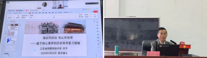 浙江省嘉兴市原高中历史教研员、正高级教师戴加平从新高考“教-学-评一致性”要求为切入点,强调“基础+视野+能力”三大基本点建构的教学策略。江苏省南菁高级中学何平老师通过教材专题整合、学术动态追踪和社会热点关联,帮助学生构建知识体系、拓展思维深度,揭示历史学科“四层四翼”的考查导向。贵州省铜仁一中张华英老师、六盘水市第二中学海亚波老师则分别围绕试题解析与教-学-评一体化路径作专题报告,为课堂教学与备考实践提供本土化经验。