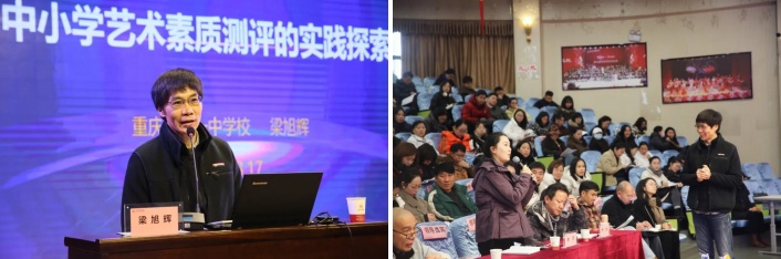 重庆市第一中学梁旭辉老师作题为《中小学艺术素质评价导向的实践与思考》的讲座,系统解析了监测、测评、评估与评价的差异,并分享重庆市艺术素质测评体系的构建经验;安顺市教科所美术教研员孙艳梅老师围绕《教学评一体化:小学美术学科质量监测的区域实践与思考》主题,以安顺市小学美术监测体系构建为例,介绍了区域质量监测的具体做法和成效,同时还针对目前监测工具和方式单一、城乡水平差异大、美术教师专业化等问题,提出对应的探索策略,进一步精细评价尺度和标准。