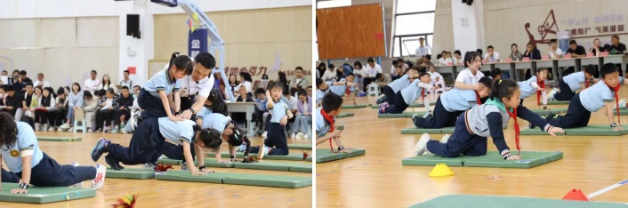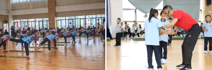 本次活动包含专业技能展示和课堂教学展示两个环节。在体操专业技能展示中,参赛教师认真以待,力求每一个动作都充分展现深厚的专业功底和良好的精神风貌,赢得在场观摩教师们的阵阵掌声。课堂教学展示环节以“同课异构”的形式展开,教学回归学校体育本源,紧扣《义务教育体育与健康课程标准(2022年版)》核心要求,突出“体育味”,展现可学习借鉴性,使用小面积场地、普适性器材开展教学,并引入AI设备赋能课堂,通过运动手环实时记录学生心率变化与练习密度,让课堂效果“看得见、测得准”。