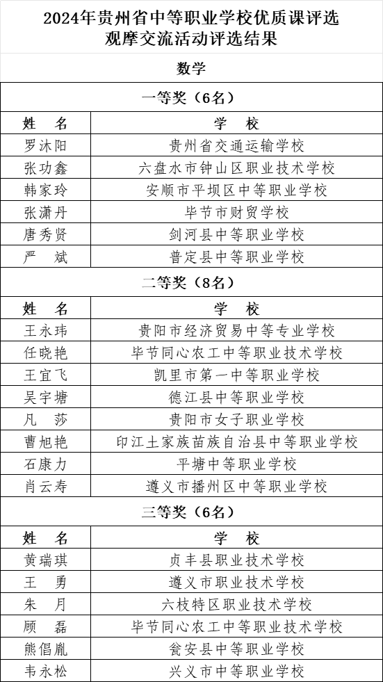 根据《省教科院关于举办2024年全省中等职业学校优质课评选观摩交流活动的通知》,2024年贵州省中等职业学校优质课评选观摩交流活动已圆满结束,现将评选结果予以公示。