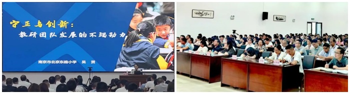 在《创想育人:国家课程高质量实施的星河实践》专题讲座中,常州市星河实验小学党支部书记、校长庄惠芬从共同愿景、课程场景、课程建构、素养导向等方面详细阐述了国家课程高质量实施的星河实践,为参研教师课程开发与实施提供借鉴;在《守正与创新:教研团队发展的不竭动力》专题讲座中,南京市北京东路小学副校长吴贤从在日常研修中提高效能、在继承发展中实现突破、在自我剖析中互促共进等方面,对守正创新是教研团队发展的不竭动力进行了具体阐释,为参研教师如何以教研促教学、促发展提供思考;南京市小营小学教学校长宋洁从校本研修的概念意义、国家背景、内涵特征、案例路径等方面,给参训者提供了研修促进教育教学变革的实践行动案例。