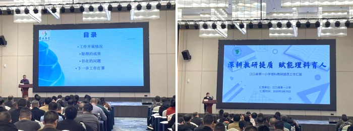 在经验交流环节,贵阳市教育科学研究所、荔波县教研室、铜仁市江口县第一小学作为市、县、校三级代表,围绕理科教研提质实践探索交流发言,为各地各校提供可借鉴、可实施的实践范式。贵阳市教育科学研究所所长杨冬宁以“构建规准体系、实现稳态发展”为要点,分享“横纵贯通”教研标准体系建设经验,通过研制四大教研工作常规明确县、校“规定动作”,形成工作闭环,以年度教学规划等推动省级提质方案落地。荔波县教研室杨胜智聚焦县域提质工作落地,介绍以系列制度方案为引领、工作手册为抓手、教学常规规范为核心,同步推进阅读强基等系统性实践情况,展现全链条推进提质成效。江口县第一小学校长石静立足基层学校实际,从健全组织体系等四个维度,分享落实提质要求、提升理科育人质量的做法与经验。
